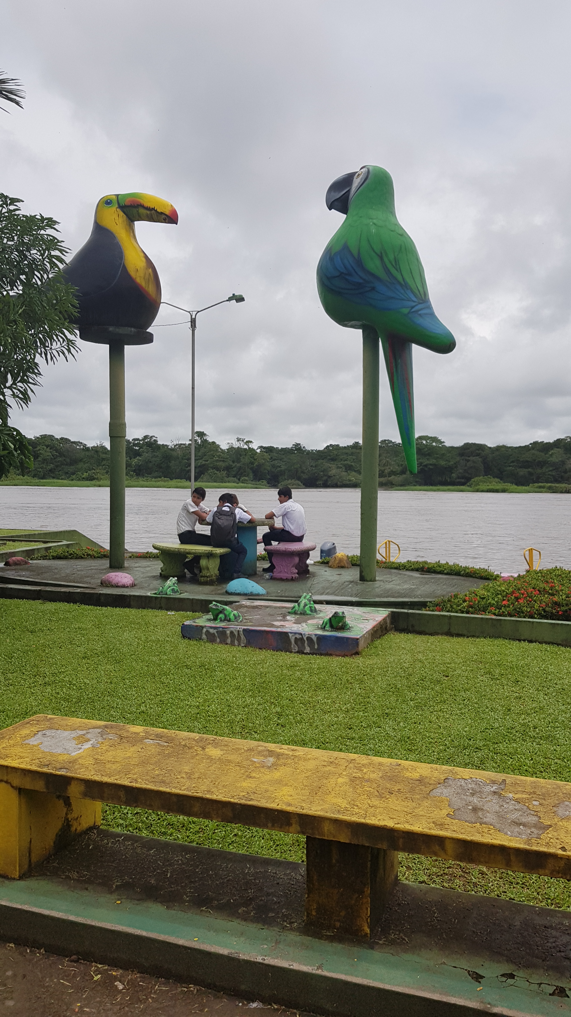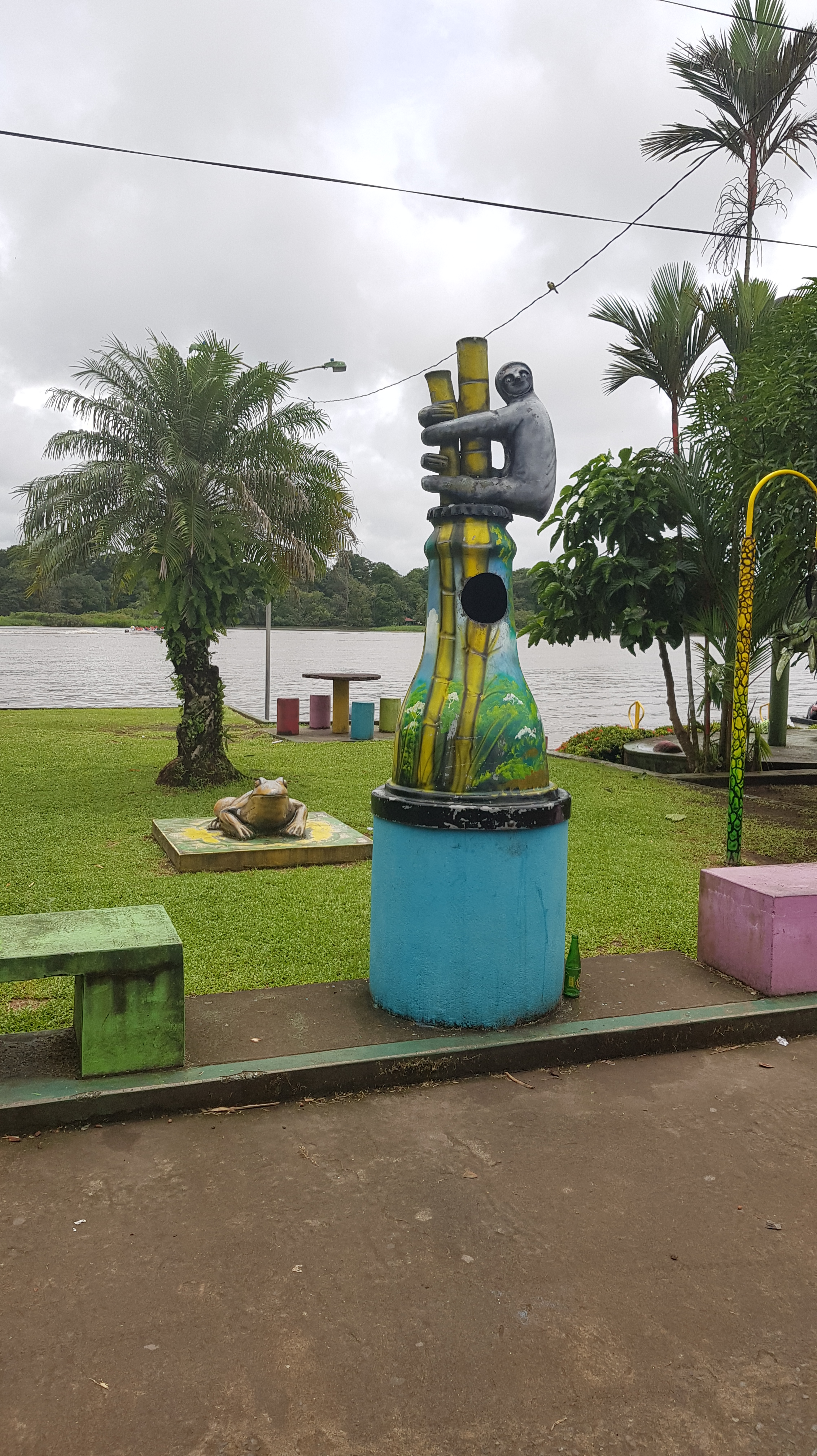 - Miércoles, nos levantamos temprano para ir a hacer ruta en Canoa (2h) por el PN Tortuguero (río & canales). Tortuguero no se considera una isla, sino un delta, ya que sus aguas están formadas por agua dulce de los canales y agua salada del océano. El tour empezó con el día nublado y enseguida empezó a llover… así que sacamos nuestros chubasqueros y continuamos el camino. Vimos monos🐒, iguanas🦎, un perezoso de 3 dedos, tucanes, guacamayos (sobrevolar) y hasta un Caimán bebé, algo más de medio metro🐊 El tour lo hemos hecho con Jessica (Tortuguero tours).