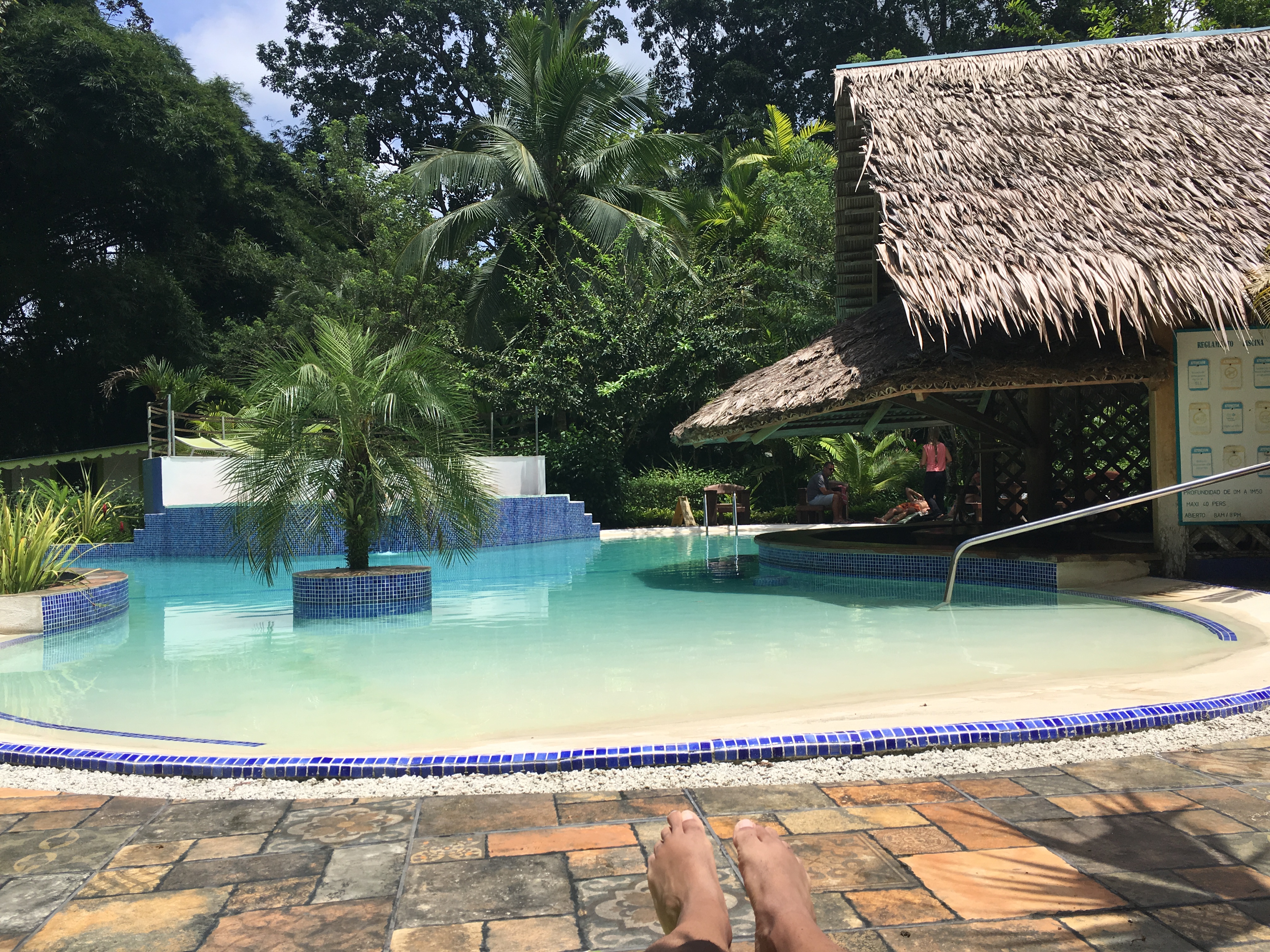 Llegamos a Cahuita por la tarde (de Arenal a Cahuita hay como unas 6 horas de camino, pero tardamos unas pocas más, ya que paramos a comer a medio camino). Nos hospedamos en 3 Bamboo ecolodge, un hotel con una piscina espectacular y rodeado de naturaleza, cerca de la playa y del pueblo.