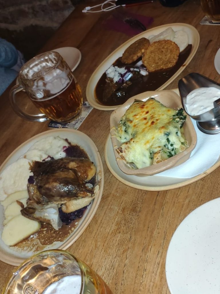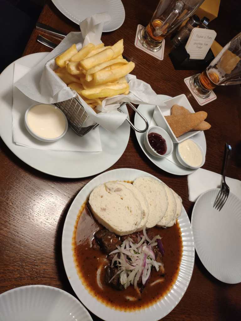 Mi plato favorito de Praga, es el «hovězí guláš» es ternera en salsa con cebolla y pan para «mojar» en la salsa, os puedo asegurar que comí cada día y me faltaba pan! ;P (es el plato de la foto de la derecha, abajo del todo).