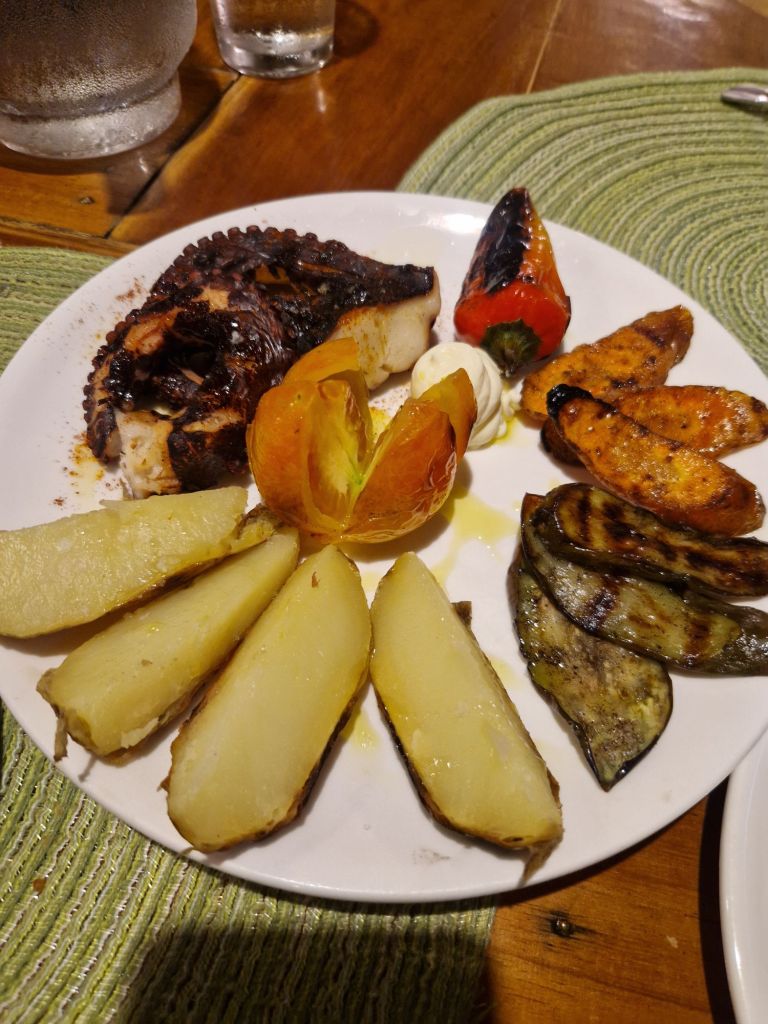 Hotel, ducha y a cenar al restaurante español Bravo… pedimos mezzle board o algo asi, hummus variados… gambas ajillo y tartar de atún (picantísimo y no lo ponía en la carta 🤬) una pena que no avisaran, pero estaba muy rico de todas formas.