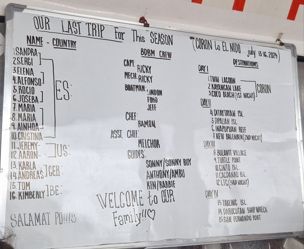Al día siguiente, fuimos a desayunar a Epic Cafe Coron, un desayuno healthy y muy rico, súper recomendable. Y ya después listos para irnos al puerto y coger empezar nuestra primera aventura por Filipinas, una expedición de 4 días en barco (599USD por persona, alojamientos, 3 comidas/bebidas y traslados incluidos). La contratamos con Big Dream boatman, y fue todo un acierto, el trato de 10, la comida espectacular, cada día algo diferente y pescado fresco, variedad para todos los gustos, y en ningún momento pasas hambre. Volvería a contratarlo con ellos sin lugar a dudas. El grupo que nos tocó, encantador, hubo muy buena sintonía entre todos, tantos los tripulantes como los viajeros.